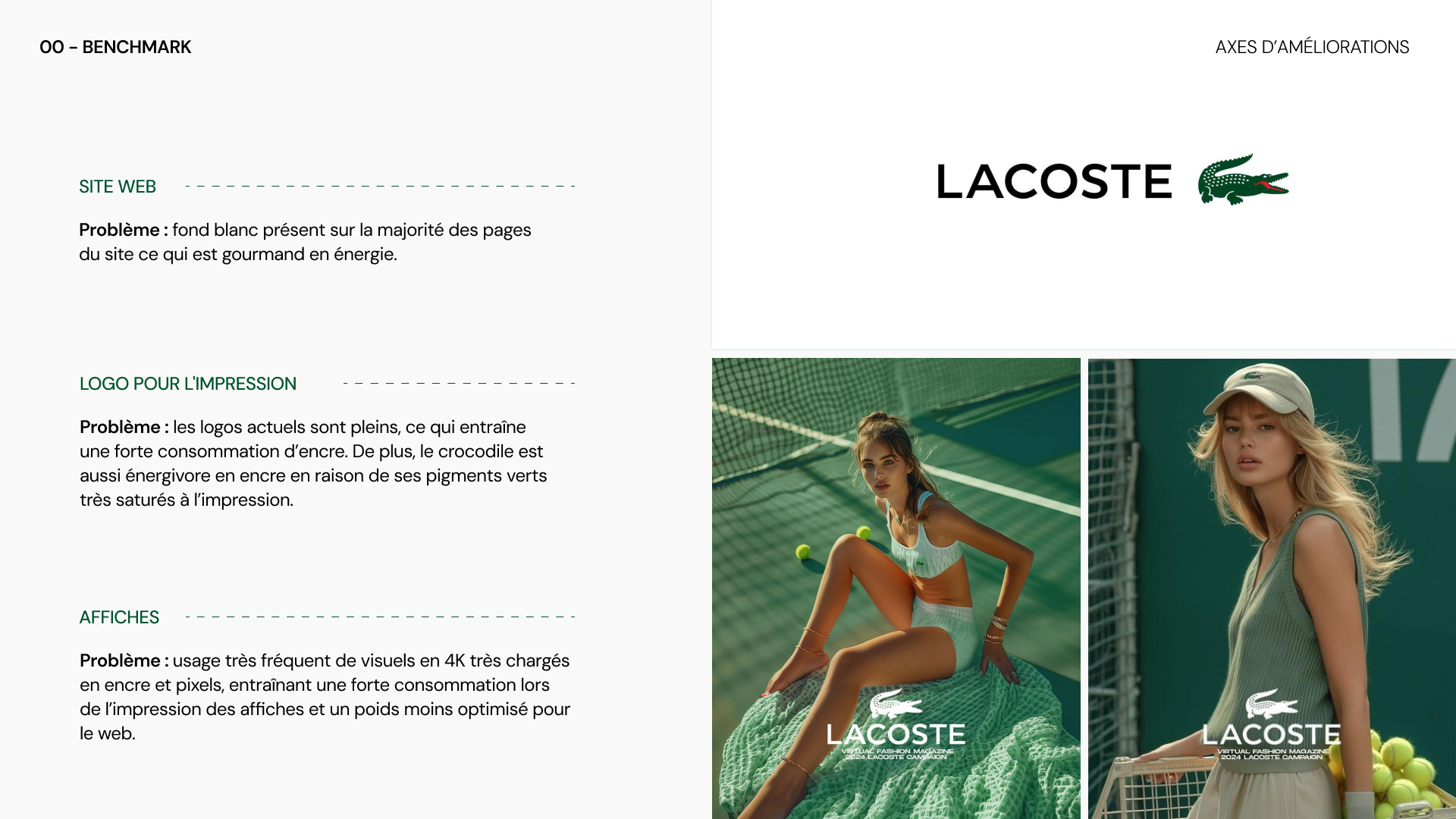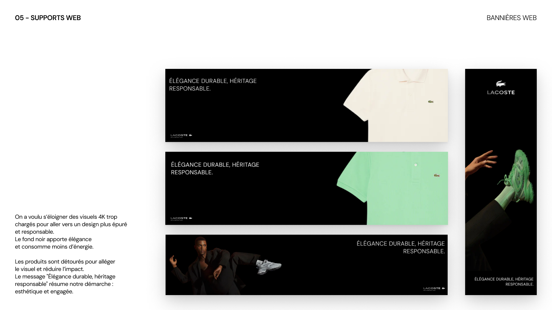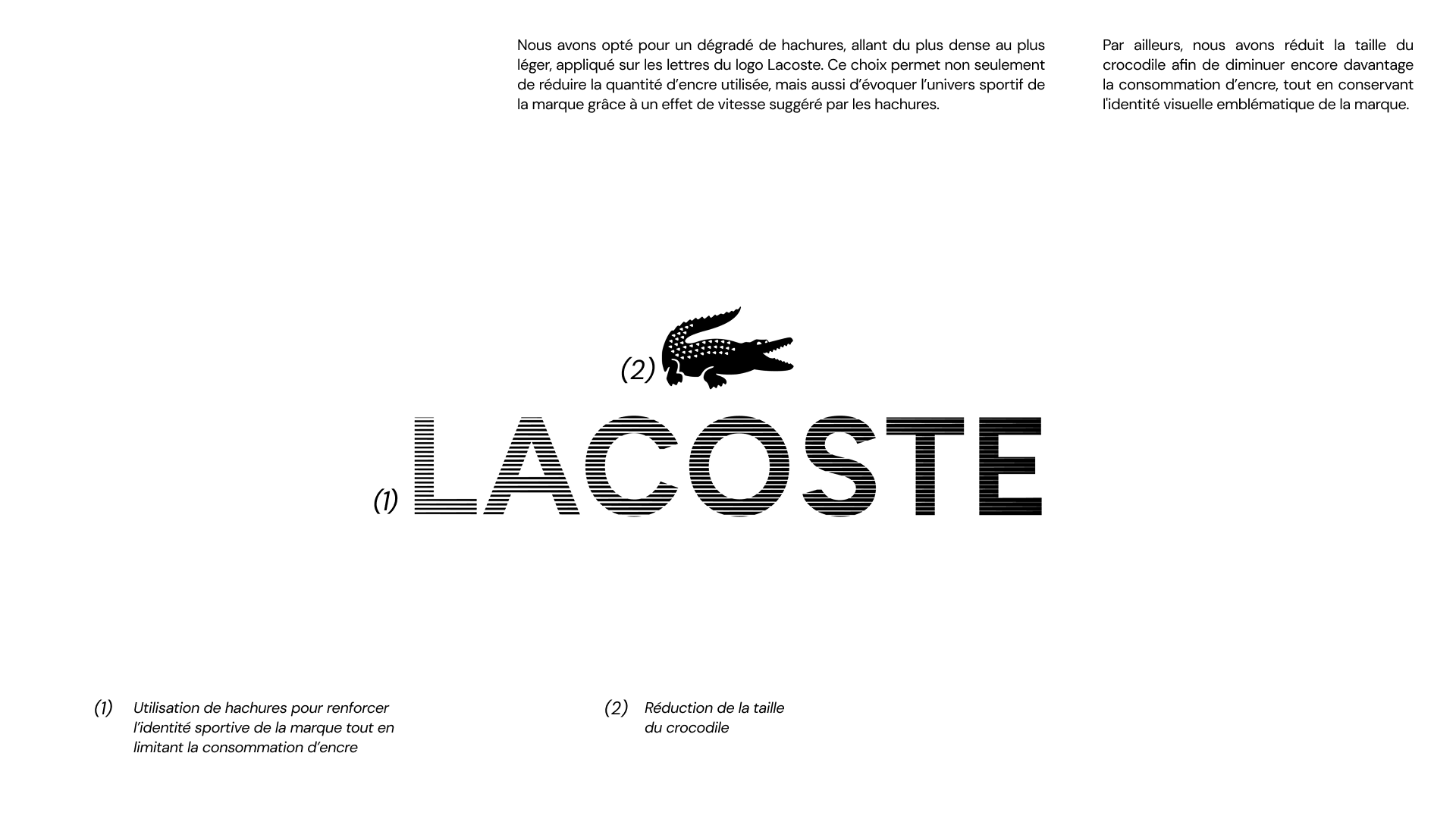 L'Éco-branding de Lacoste est un projet de refonte éco-responsable mené en équipe autour de l'image de marque Lacoste. Nous avons d'abord repensé la palette de couleurs, le packaging, ainsi que les supports de communication dans une logique de sobriété visuelle et d'impact environnemental réduit. Notre objectif étant de concilier exigence esthétique et engagement durable.