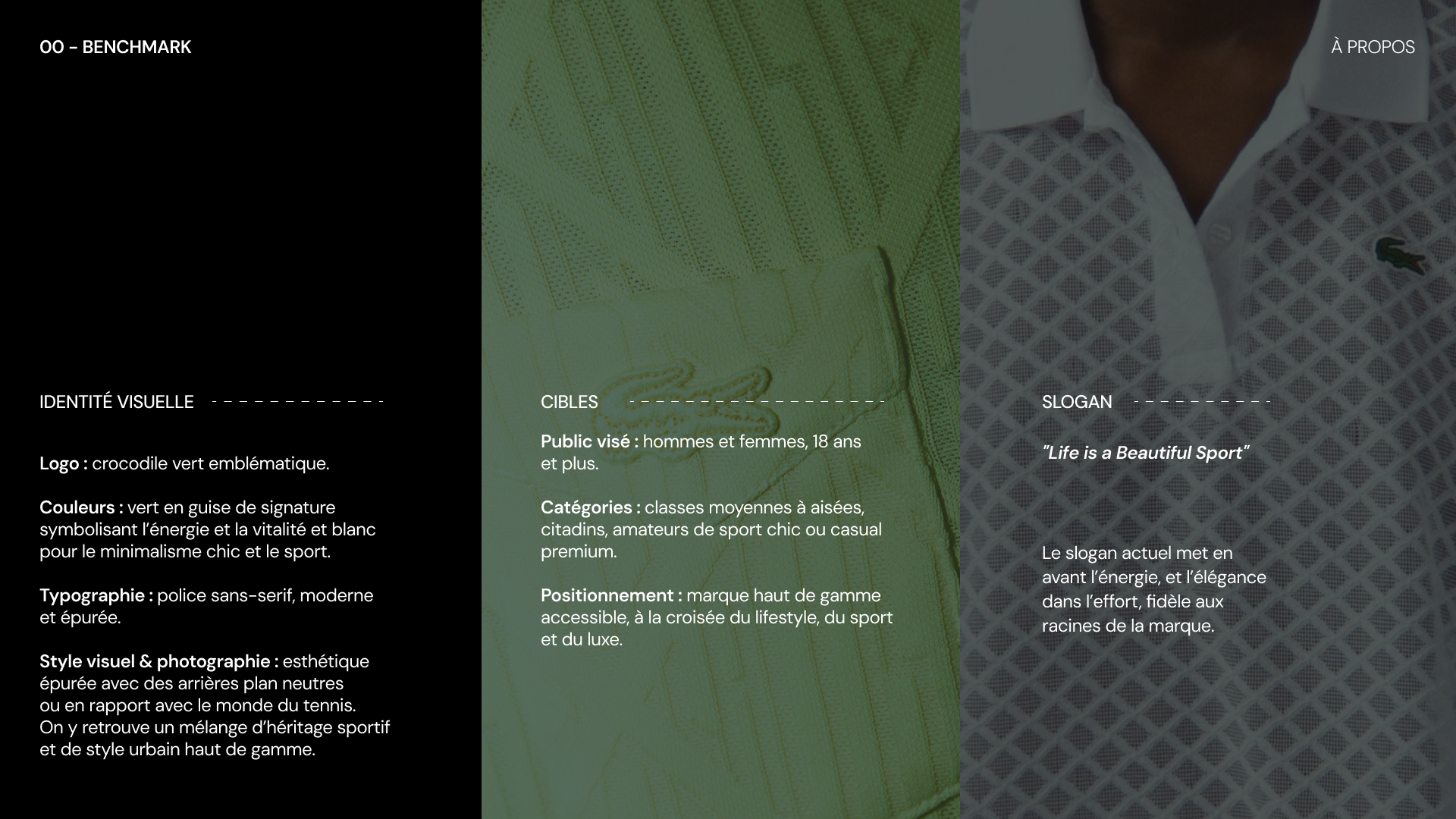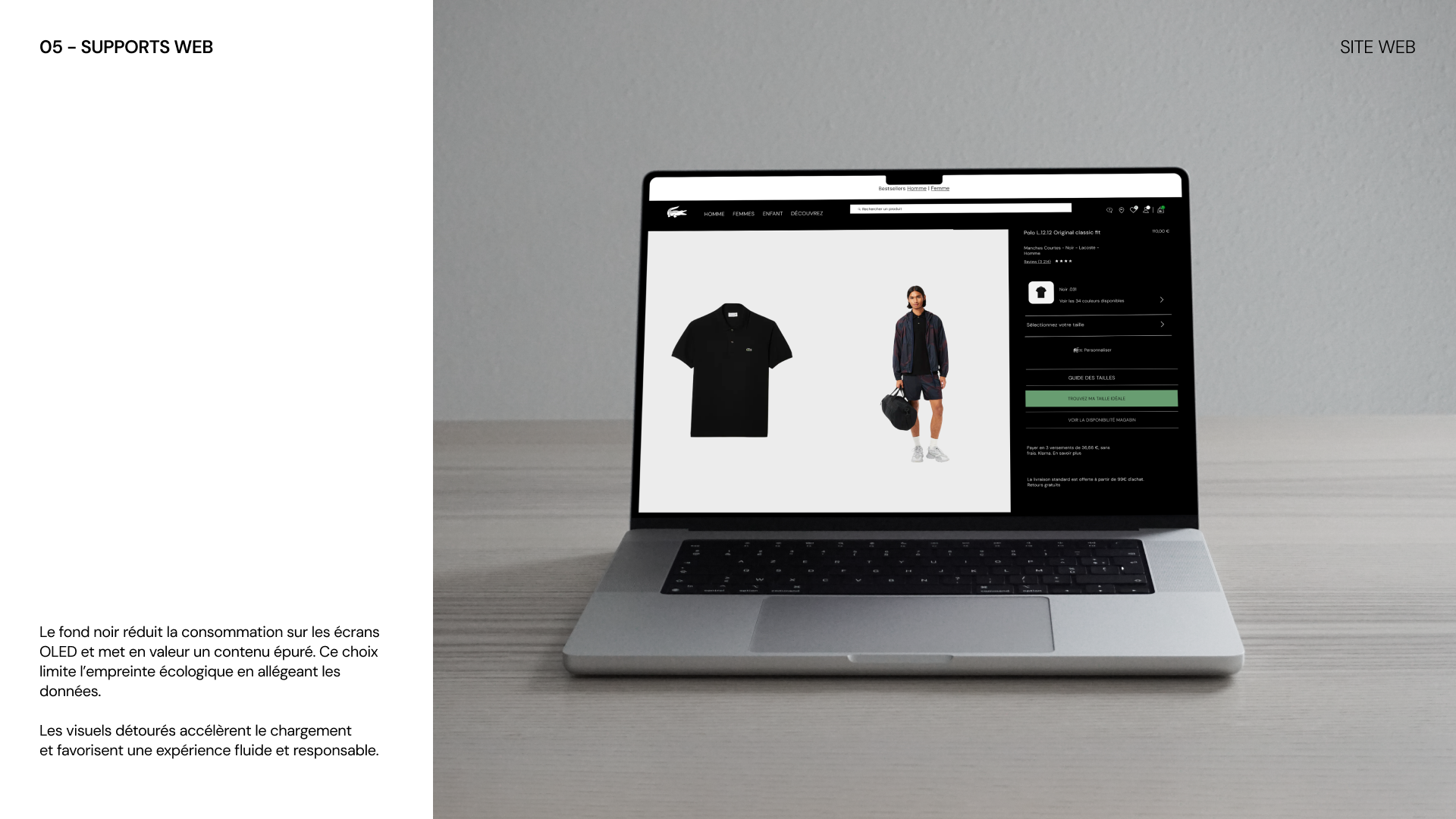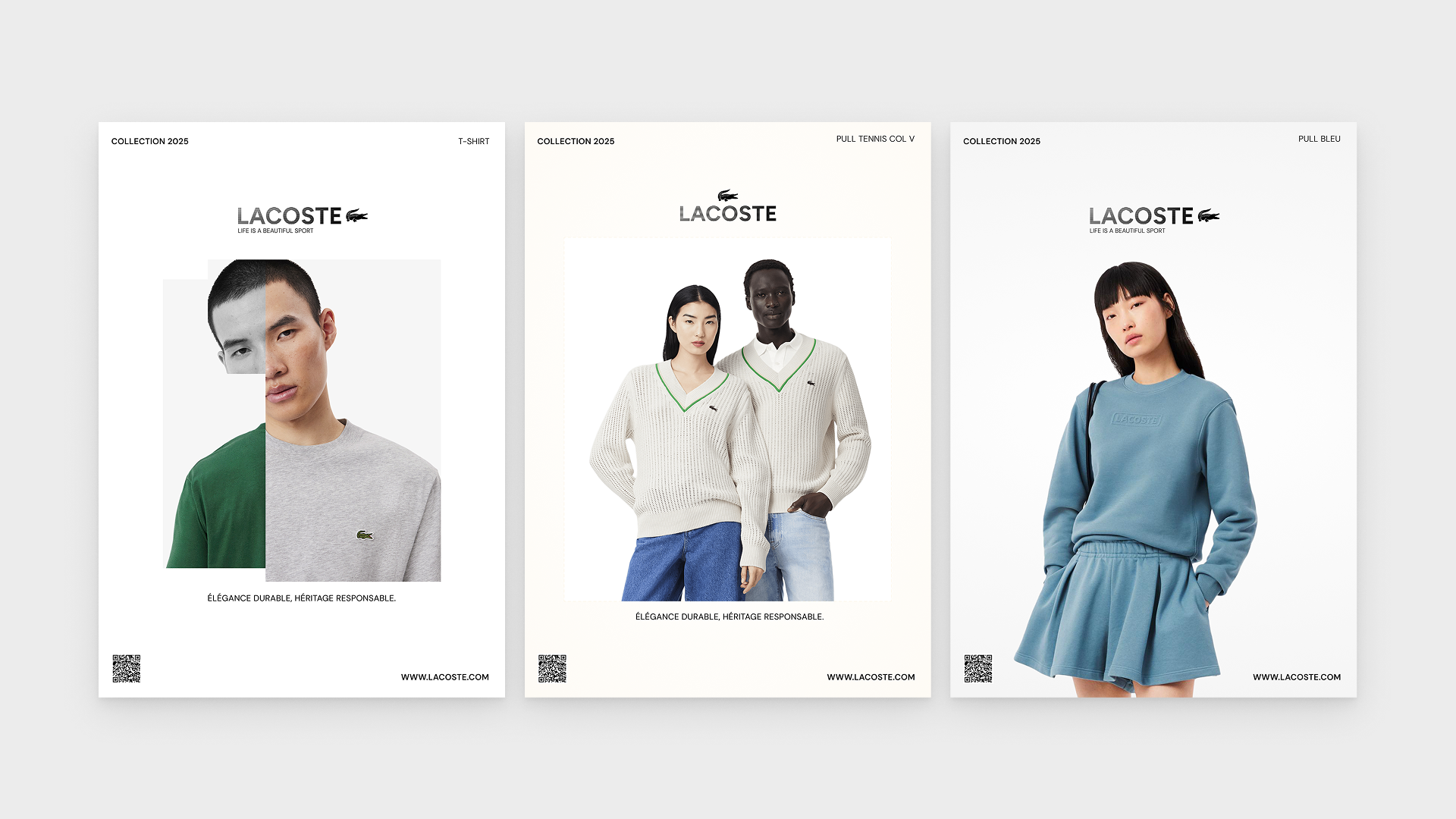 L'Éco-branding de Lacoste est un projet de refonte éco-responsable mené en équipe autour de l'image de marque Lacoste. Nous avons d'abord repensé la palette de couleurs, le packaging, ainsi que les supports de communication dans une logique de sobriété visuelle et d'impact environnemental réduit. Notre objectif étant de concilier exigence esthétique et engagement durable.